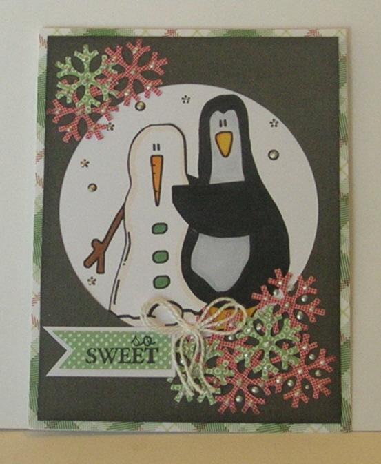 Card 1: Uses an image from Birdie Brown for her November Challenge. I am also going to link it up to Sweet Stampin' Challenge as the theme is Snow People. Also, there is a new challenge site: Addicted to CAS that requires few embellishments and lots of "white space". With only one embellishment I think this card qualifies. Their code word is Snow.